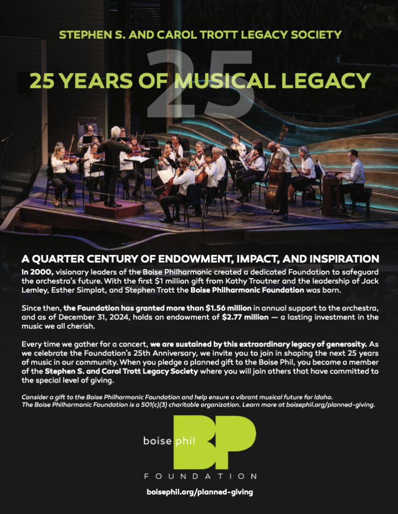 Please contact the Boise Phil Development Office for more information about the Steve S. and Carol Trott Legacy Society or to inform us of your plans to ensure the future of Boise Phil through a planned gift.